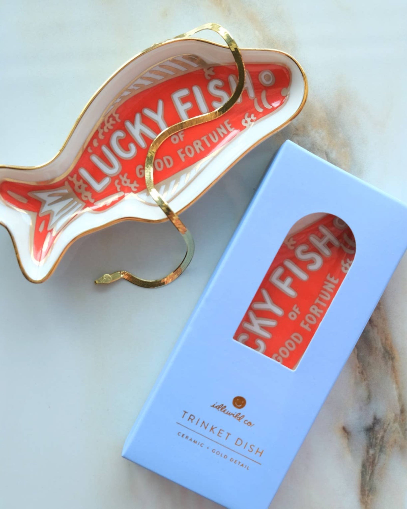 Bring good luck and fortune into your life with our Fortune Fish Trinket Dish. Made of high-quality ceramic and hand-painted with a delicate gold fish design, this dish is a charming accessory for your jewelry and small trinkets. Perfect for gifting or as a stocking stuffer, this wonderful trinket dish will surely bring a smile to anyone's face.