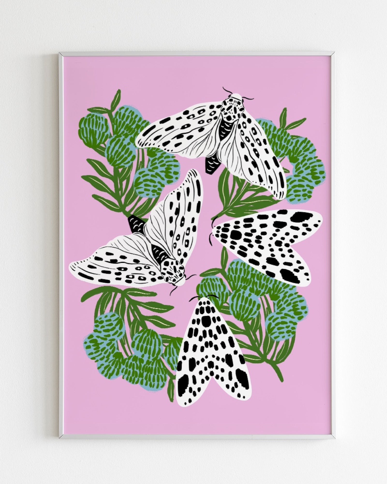 This is an 8 x 10 art print of beautiful leopard moths surrounded by flowers by independent female artist, Tara Reed. Bright and modern - bugs are beautiful! This item was handmade in Tara's small studio in Raleigh, North Carolina. She is a proudly women owned business and hopes her art brings you a bit of joy.