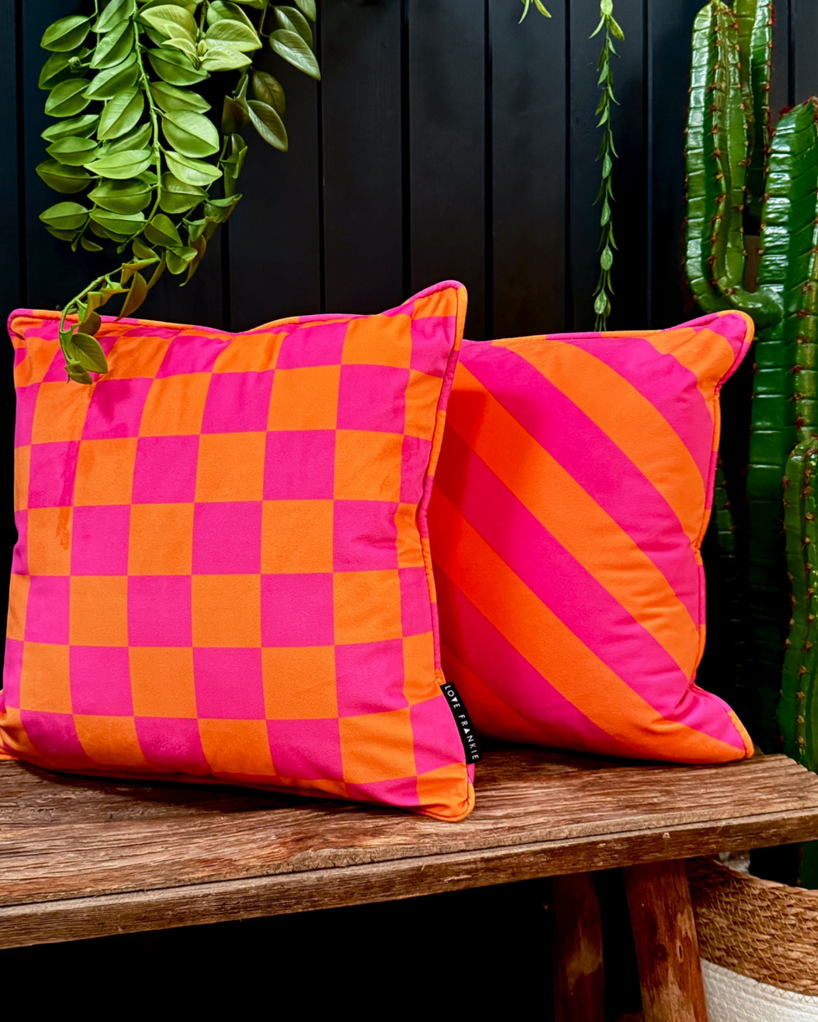 Add a burst of joy with the Helter Skelter Cushions in Tutti Frutti. Made from soft cotton velvet, these reversible covers showcase vibrant orange and pink hues—featuring a fun checkerboard pattern on one side and cheerful stripes on the other. The discreet zipper ensures a neat finish, and for extra plushness, we recommend choosing larger pillow inserts. Inserts are not included, making this the perfect cover to brighten your space with ease and flair.