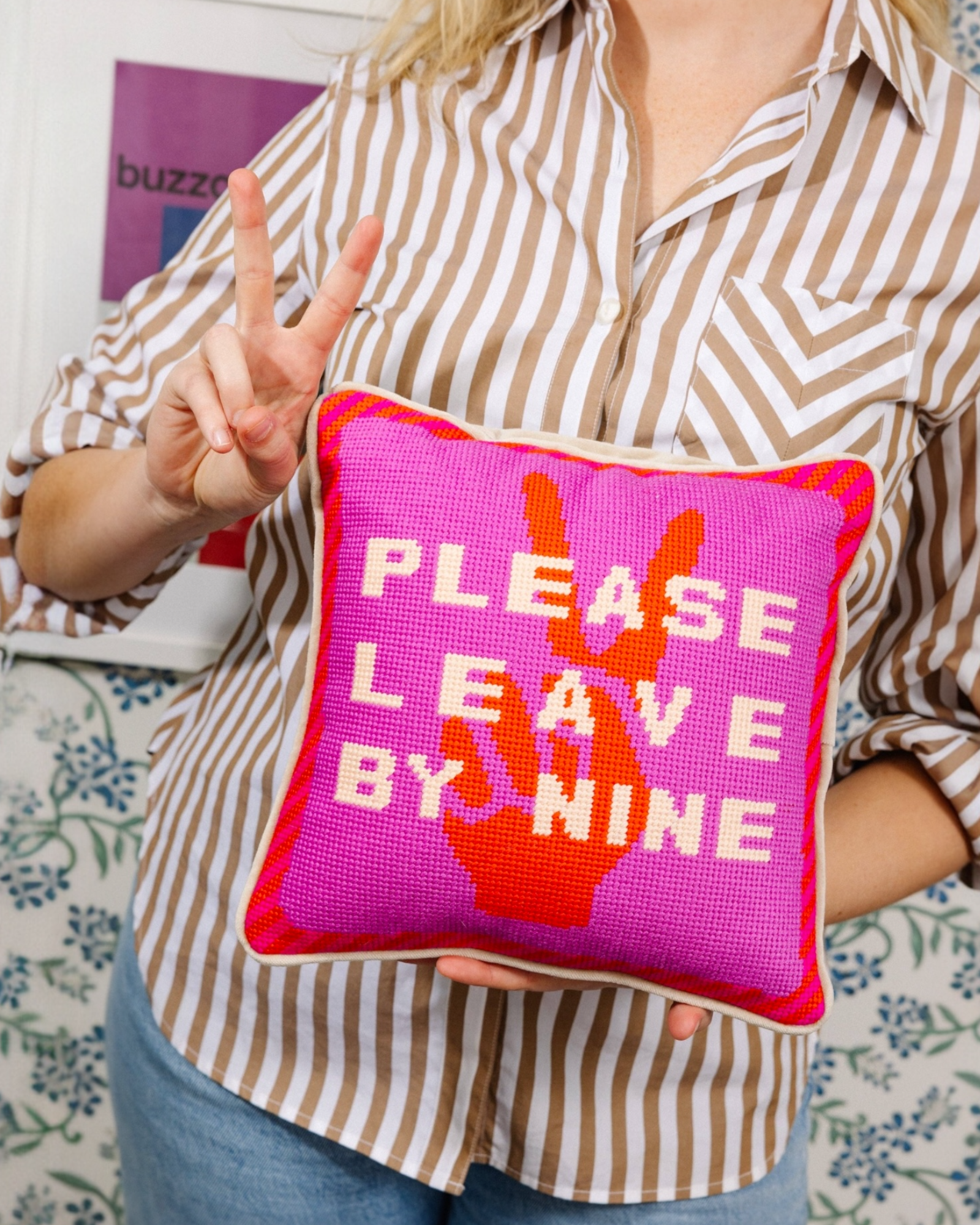 Add a touch of charm to your décor with the Leave by Nine Needlepoint Pillow. This playful-meets-stylish needlepoint pillow is sure to spark joy and make a great gift. Perfect for making a statement in any room! Small pillow, big statement!