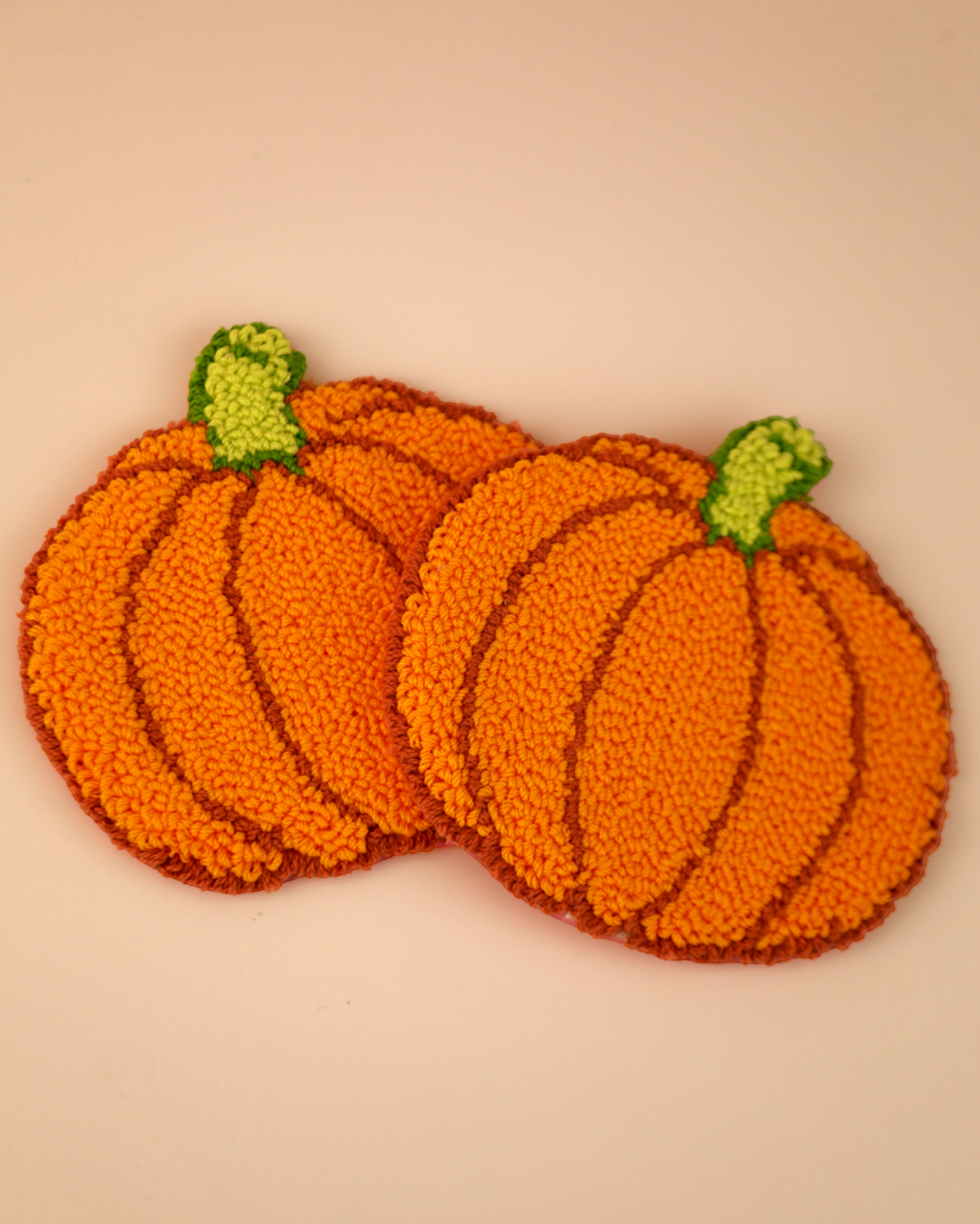 Add a warm, festive touch to your fall gatherings with these hand-tufted pumpkin mug rugs. Featuring beautiful autumn colors, this set of two coasters is perfect for protecting surfaces while enhancing seasonal decor. Celebrate the cozy spirit of fall with every sip.