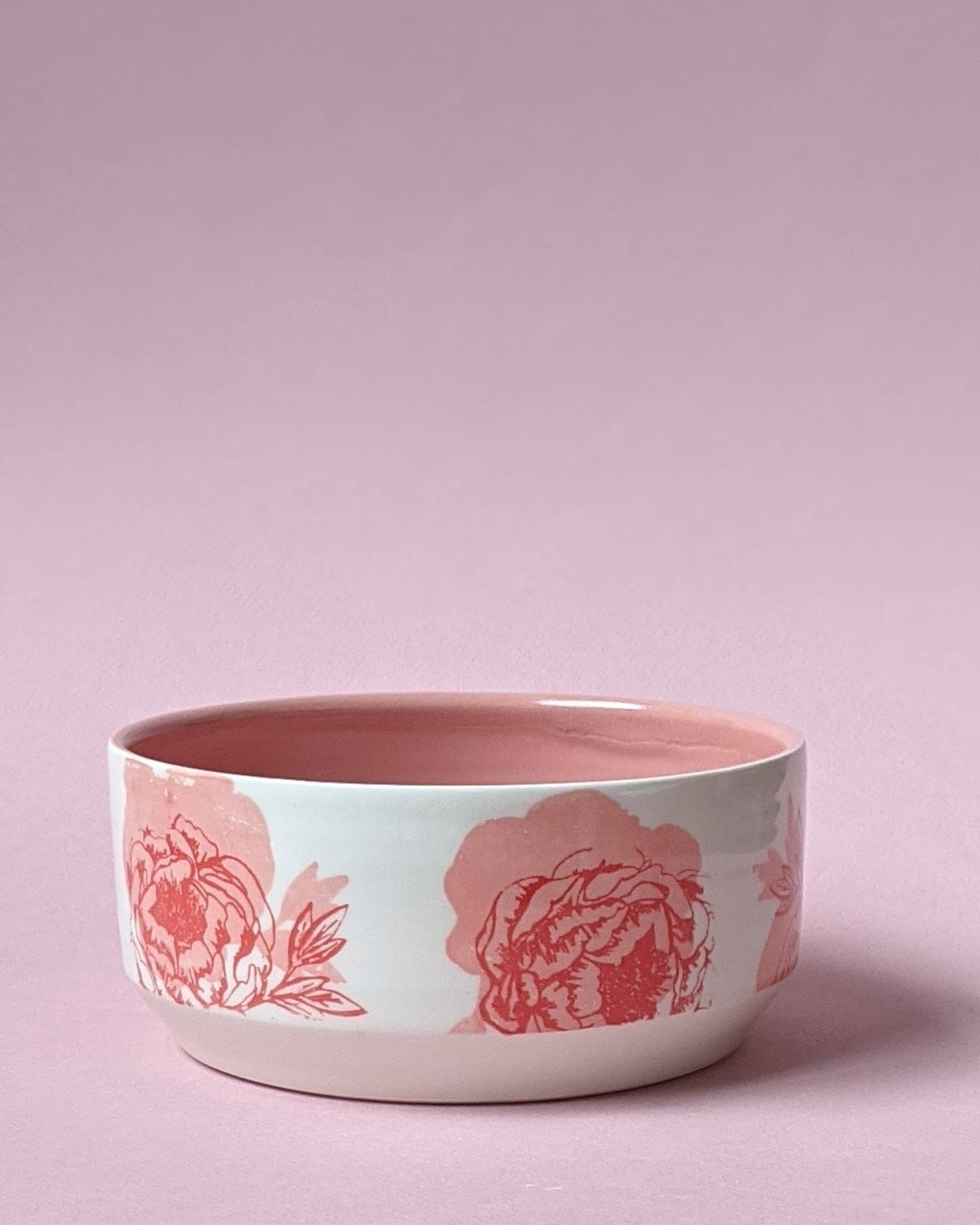 Each Sweet Rose bowl is a one-of-a-kind treasure, hand-thrown in porcelain and adorned with screenprinted pink roses trimmed in vibrant red. The glossy clear glaze on the outside lets the artistry shine through, while the interior's matte pink finish adds a delightful surprise. Whether you're serving your favorite snacks or simply displaying it as a conversation piece, this handcrafted ceramic brings joy and personality to your space.