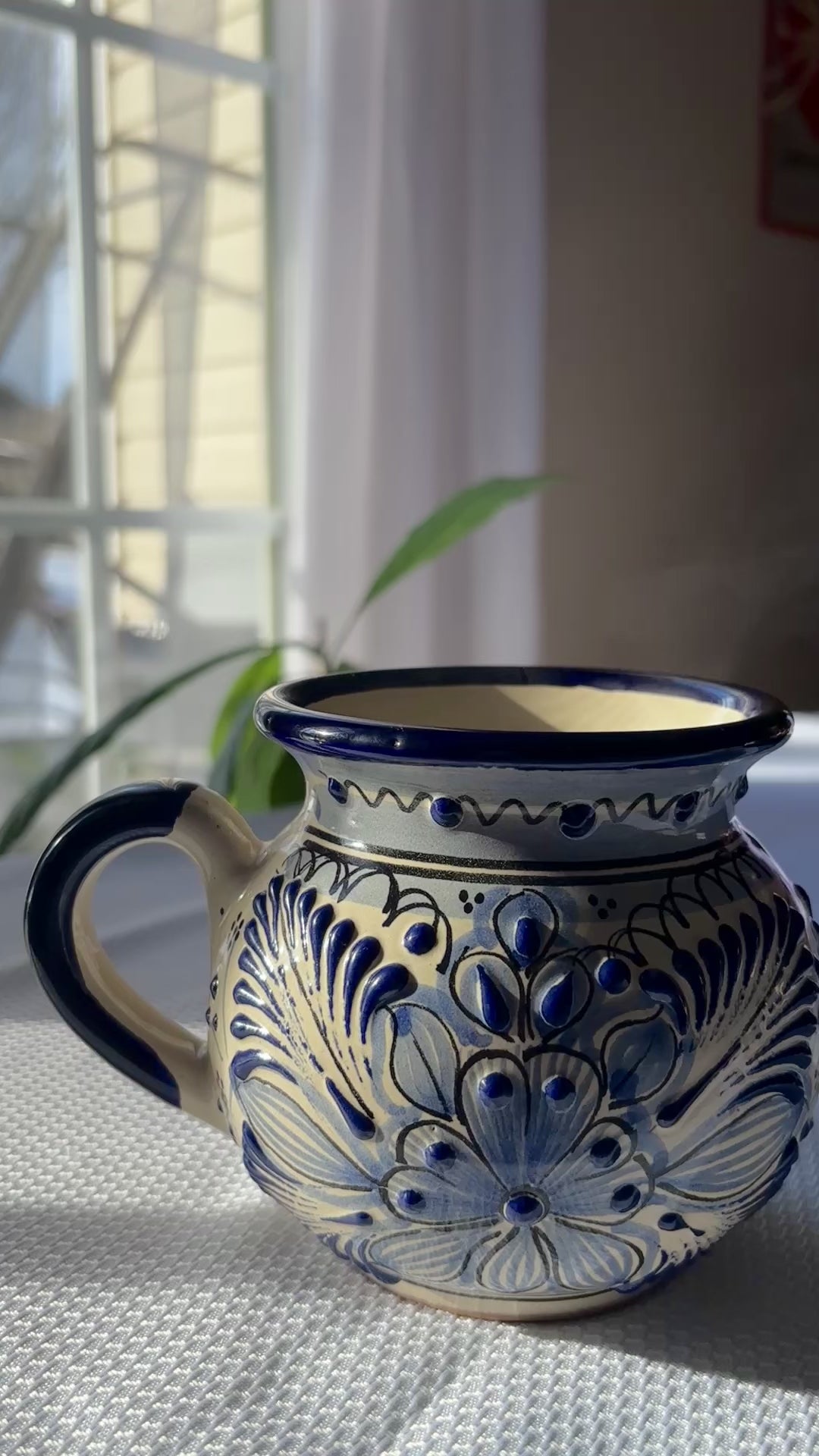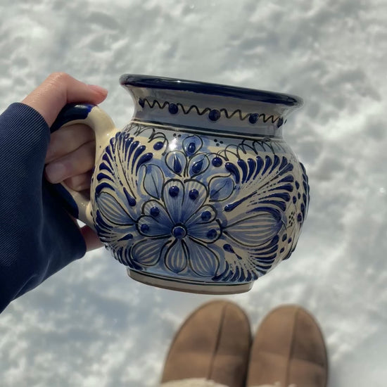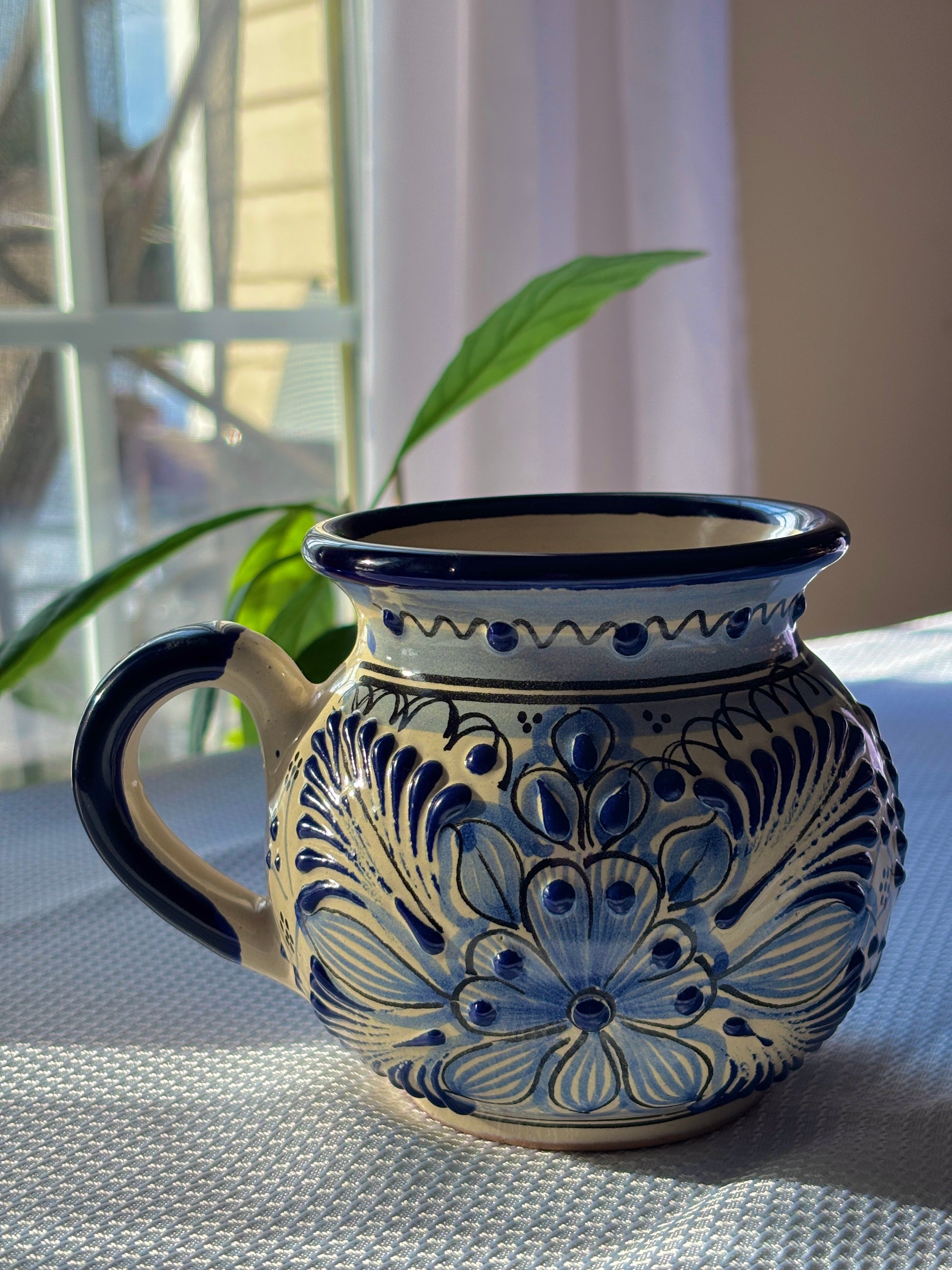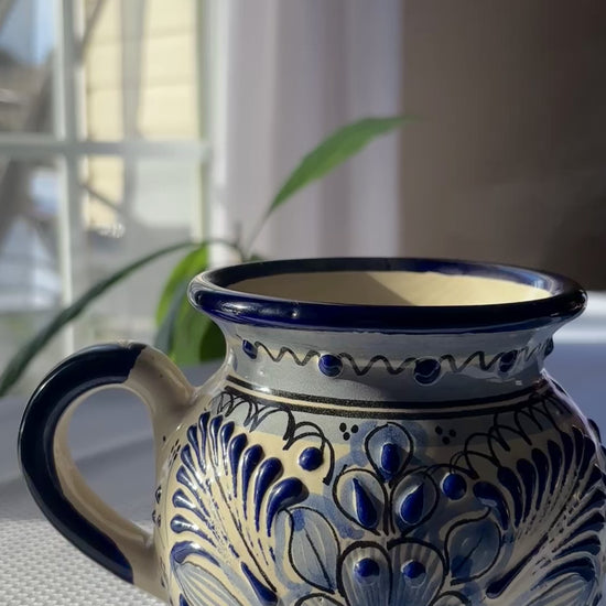 Handcrafted with vibrant cobalt blue details, this Talavera-inspired mug brings artisan charm to your daily ritual. Each piece is hand-painted by skilled artists, making it a one-of-a-kind treasure that celebrates traditional Mexican craftsmanship. The rich, jewel-toned glazing transforms an ordinary moment into something special—whether you're sipping morning coffee or evening tea. Perfect for those who appreciate beauty in the everyday and love supporting authentic, handmade design.